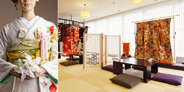 京都で花嫁になるなら、凛とした美しさと女性らしいたおやかさを身につけたいもの。そこでおすすめしたいのが、京都西陣の織元とコラボして織り上げた色打掛や白無垢。神社での挙式や、和の情緒あふれる会場に、ひときわ映える色遣いも見事です。